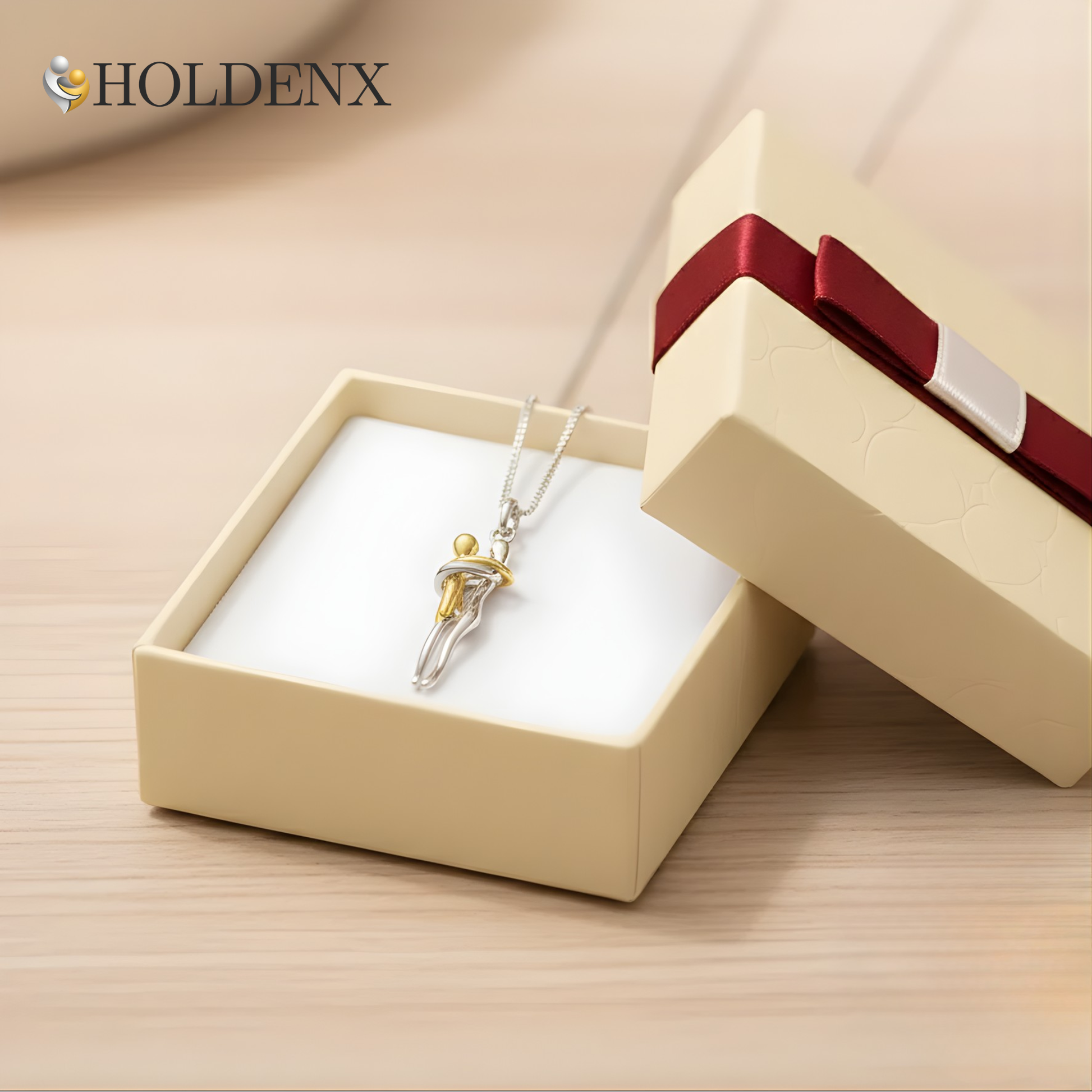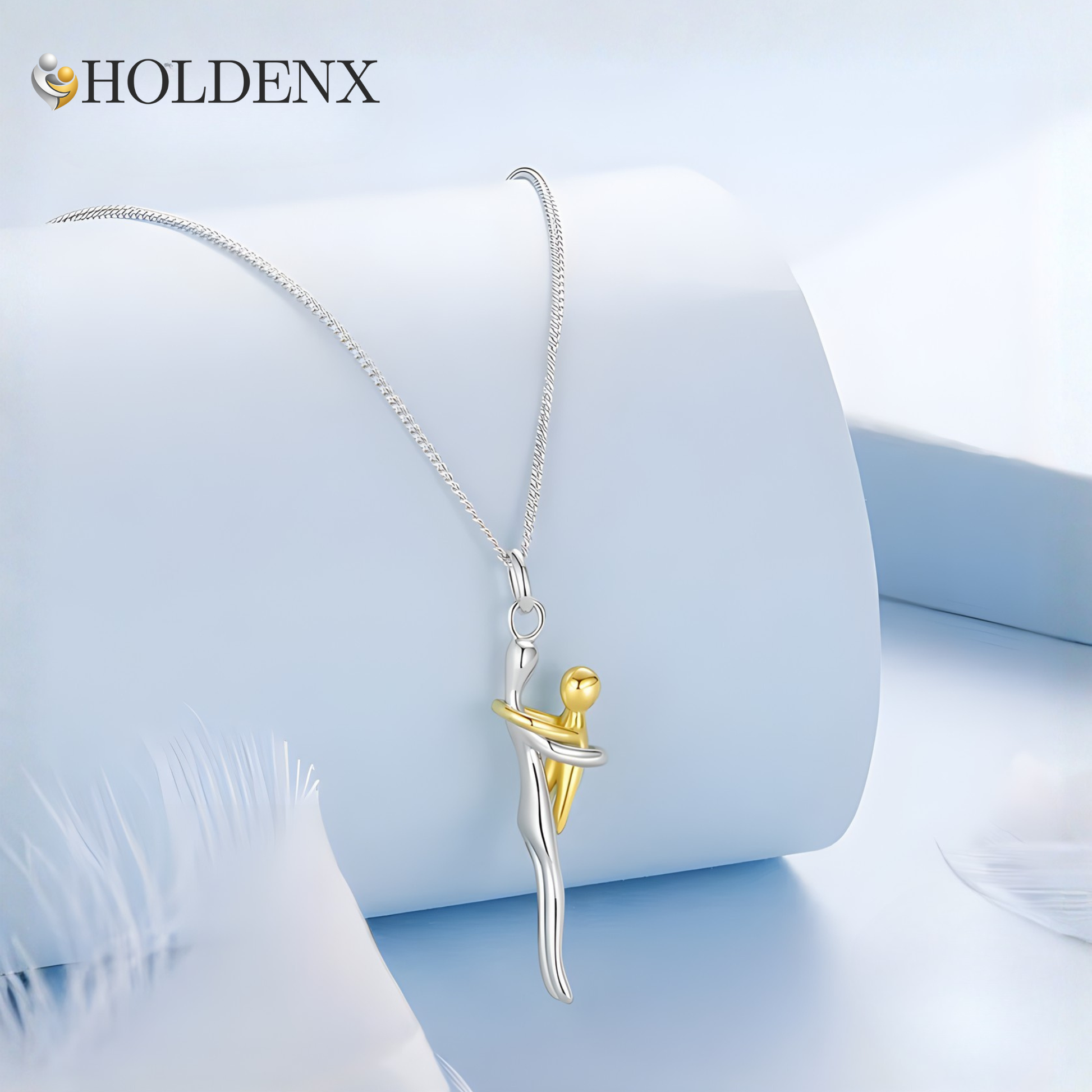 Collar femenino de bisutería con un colgante simbólico que representa el abrazo entre una madre y su hijo o hija.